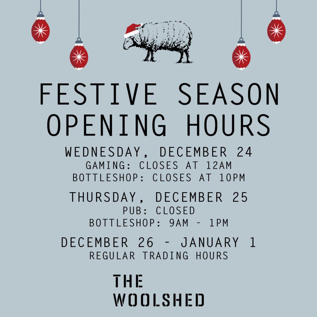 Christmas Eve: bottleshop closes at 10pm, gaming closes at 12am